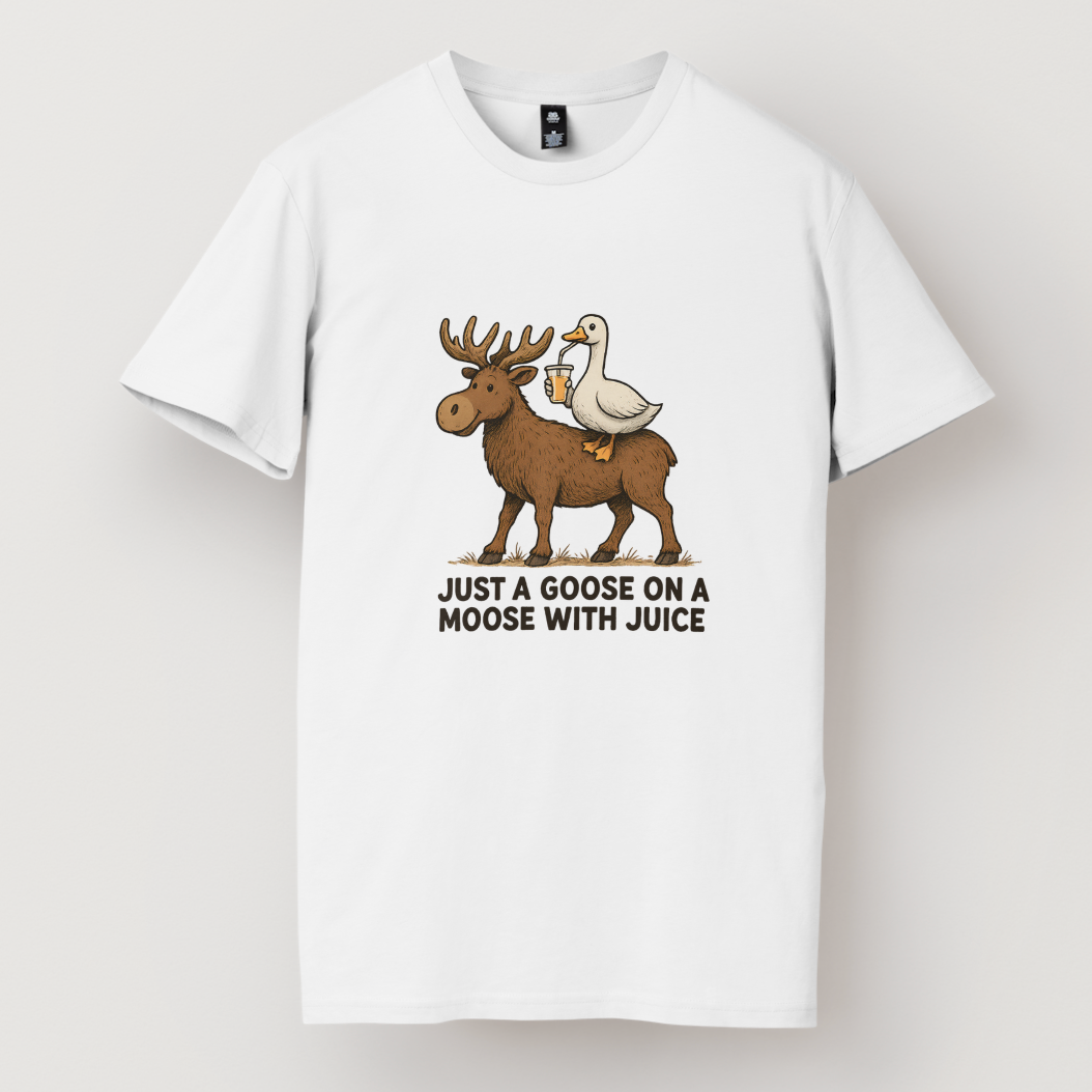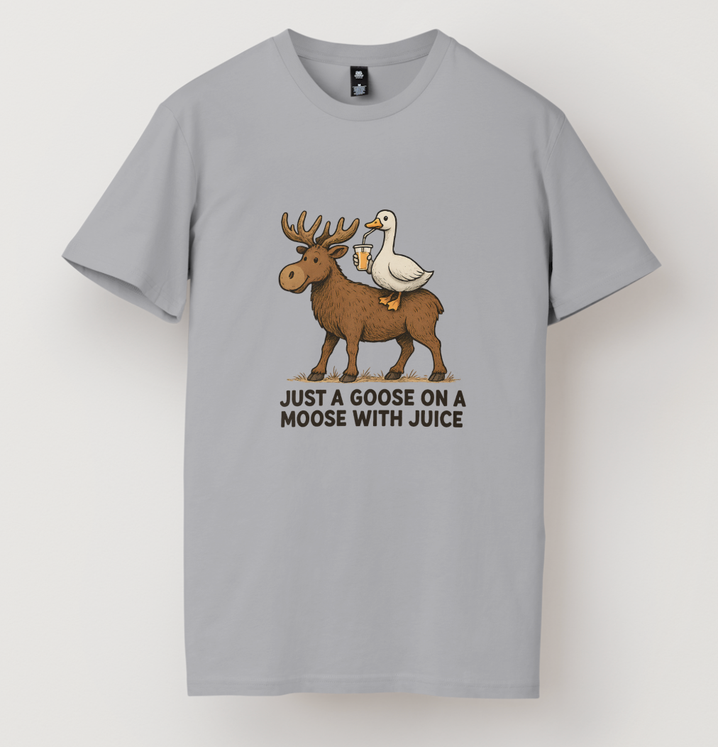Goose on a Moose with Juice Adult Tshirt - Gray / S is backordered and will ship as soon as it is back in stock.